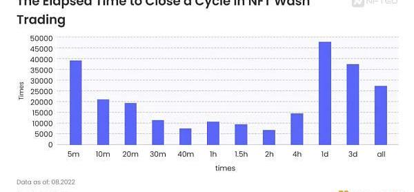 為什么一天內的閉環交易也是一個小高點呢?研究發現,這些項目中的刷單交易呈現一種特征:通常由某個地址,在一天內將自己資產中的所有NFT交易一次,并在之后一天交易回來形成閉環。因為NFT的基數夠大,所以這種看似“遲緩”的刷單交易往往能產生巨大的交易量,進而產生市場繁榮的虛假景象。