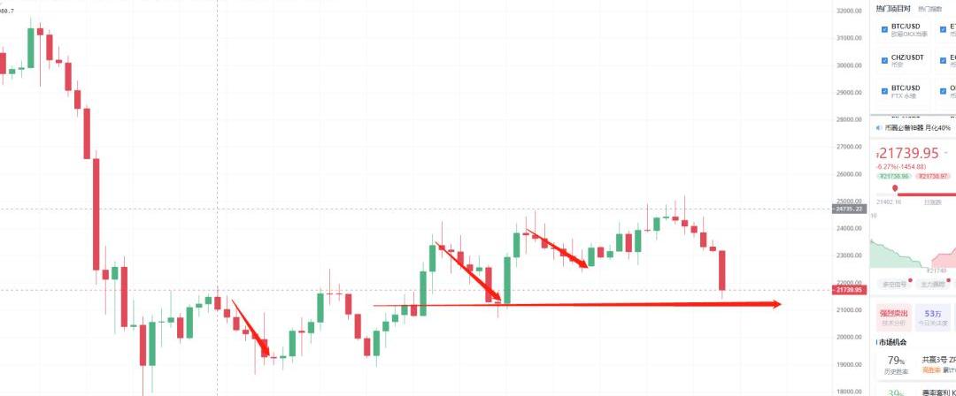 基本和提示的差不多,BTC回調23000以下之后加速下跌,跌破了日線,周線,以及30日線的支撐22000