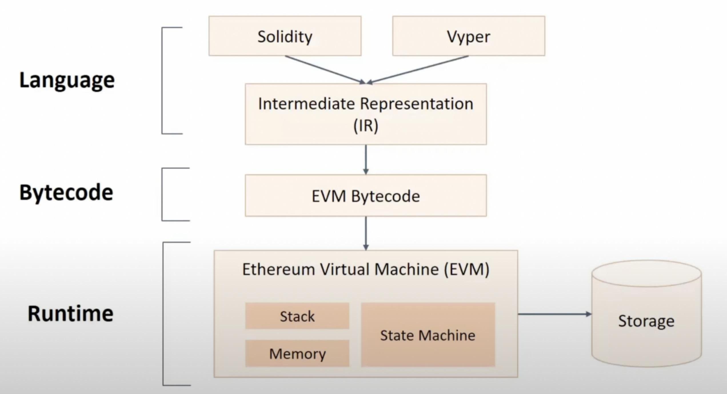 EVM指的是以太坊虛擬機,它相當于執行引擎,是以太坊智能合約的運行時環境。開發者通過高級編程語言如?Solidity編寫業務邏輯,然后編譯器把代碼編譯成低級編程語言字節碼并執行相應指令修改系統狀態。EVM是基于堆棧結構的虛擬機,在執行opcode的時候需要和stack、memory、storage交互。