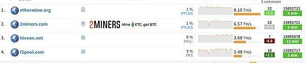 另據miningpoolstats數據顯示,ethermine.org、2miners.com、hiveon.net、?f2pool.com、poolin.com為ETC主要礦池。