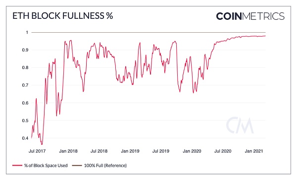 當區塊持續滿負荷時,這種機制會帶來更多問題。由于交易發送方爭奪稀缺的空間,gas費用將被持續抬高。自2020年夏季以來,以太坊區塊負載一直保持95%以上。在2021年3月份,區塊負載已經高達97%-98%。