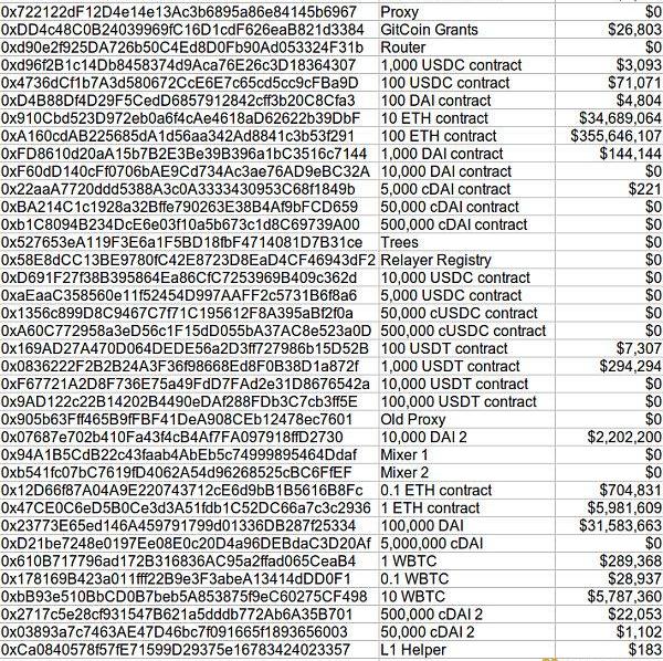 @BowTiedlguana整理出了一份在此次制裁中被納入SDN名單的錢包地址名單,這些地址內存放著總價值為4.37億美元的穩定幣、ETH和WBTC。