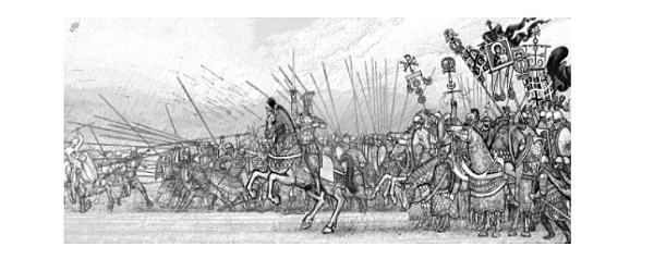 拜占庭將軍將其部隊召集起來,這樣做的目的不僅是讓士兵感到勇敢和興奮,而且還要向他們保證其他所有人都感到勇敢和興奮,并且也會向前沖鋒,因此單個士兵不僅僅是獨自向前沖鋒自殺。