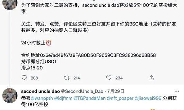 一開始,項目方還想通過空投,來對其推特粉絲做獎勵來形成增粉的目的。